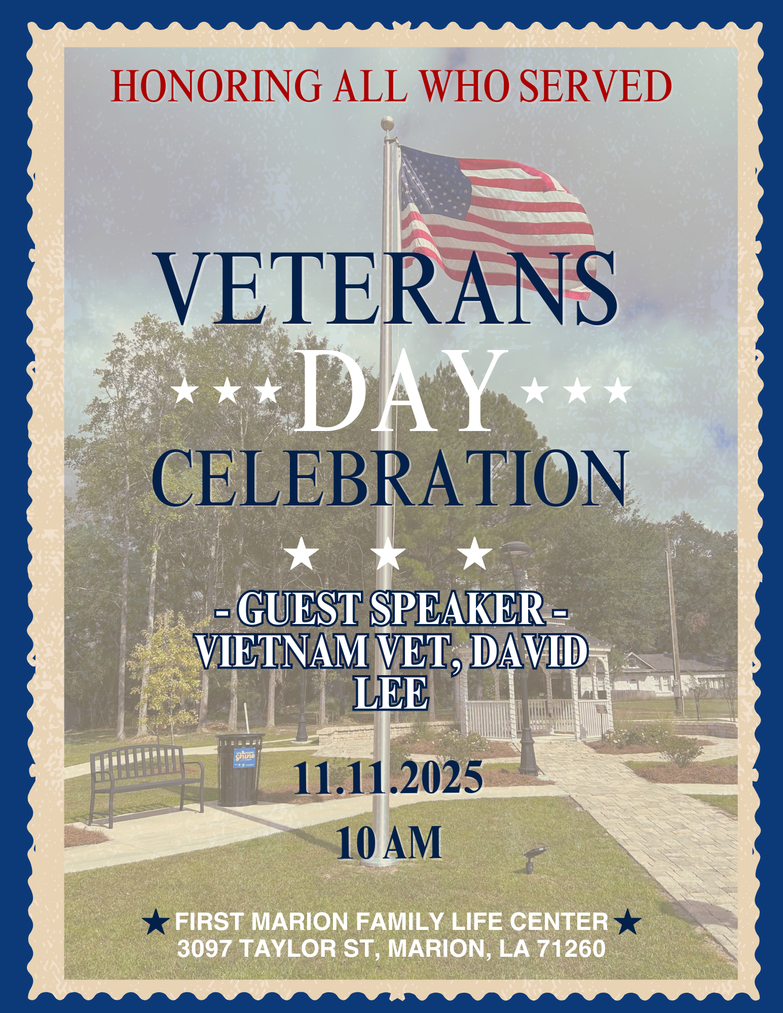 You’re invited to attend & support our veterans & thank them for their service to our country! The annual Marion Veteran’s Day Celebration is scheduled for 10AM, Tuesday, November 11, 2025 at the First Marion Family Life Center, Taylor St./Huttig Hwy. David Lee, Vietnam Vet will be the guest speaker.