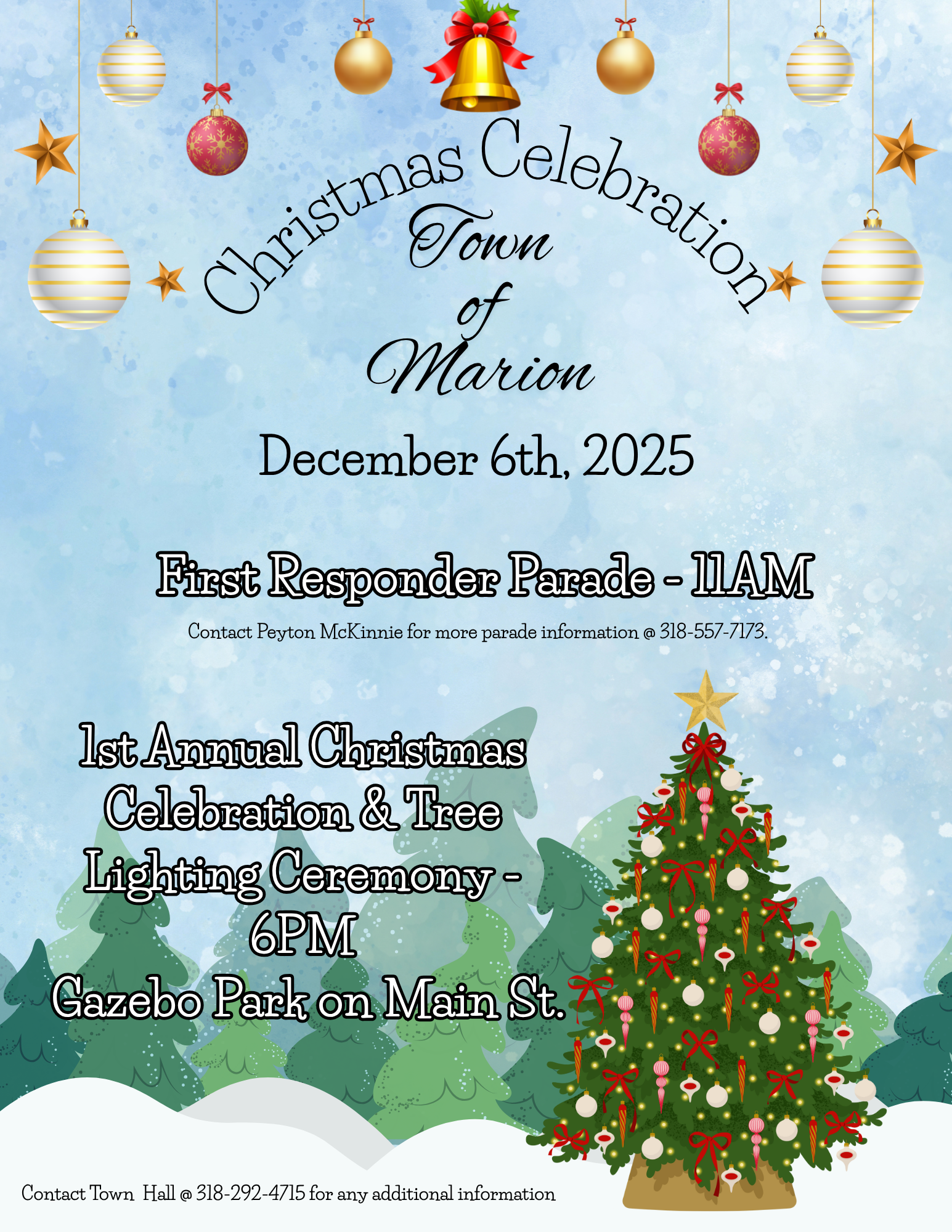 The Town of Marion invites you to the Annual Christmas celebration. The celebration will start with the First Responder parade and end with the town's Christmas tree lighting ceremony. We welcome all to attend and share this wonderful time of year together.